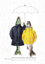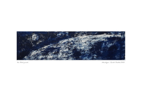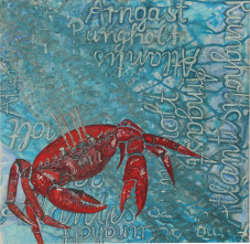 Im Watt ist ein stetiger Wechsel zwischen Wasser und Land: Zweimal am Tag wird es während des Hochwassers überflutet und fällt bei Niedrigwasser wieder trocken. Mächtige Gezeitenströme und glucksende Priele durchziehen diese Landschaft, die das Revier der Strandkrabbe ist. Quer umherlaufend spreizt sie abwehrend und bereit zu kneifen ihre Scheren. Gewaltige Sturmfluten rissen in vergangenen Zeiten Dörfer, Städte und ganze Landstriche mit sich fort. Arngast im Jadebusen, Rungholt vor der nordfriesischen Küste und das mythologische Atlantis sind diese vom Meer verschlungenen Orte, im Bild mit weißer Schrift dargestellt. Dazwischen in grauer Schrift schemenhaft die Bezeichnungen für die vorhandenen Sandbänke und Untiefen im Watt, ständige Gefahrenstellen für die Schifffahrt.