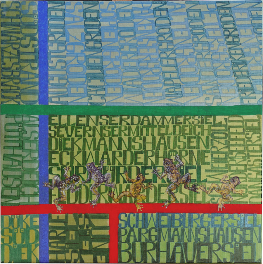 Die Marsch ist nacheiszeitlich entstandenes Schwemmland. Auch in mühevoller, geduldiger menschlicher Arbeit dem Meer abgerungen ist der Marschboden nun fruchtbares Grün- und Ackerland. Für die Entwässerung der teilweise unter dem Meeresspiegel liegenden Gebiete sorgen die endlosen Entwässerungsgräben, in denen sich die Frösche tummeln. Schnurgerade Straßen und Wege verbinden die Dörfer, deren Namen die All-over-Struktur dieses Bildes formen.