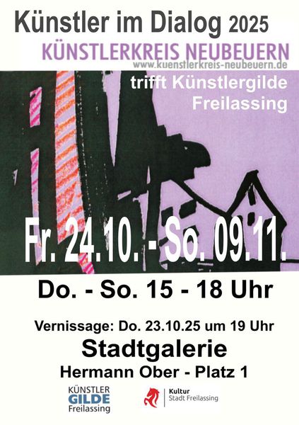 Der Künstlerkreis Neubeuern wird Werke von 18 Mitgliedern in der Zeit vom vom Fr. 24.10. bis So.09.11.2025 in der Stadtgalerie Freilassing am (Altes Feuerwehrhaus) am Hermann Ober Platz 1, präsentieren. Familie Emanf aus Ainring begleiten die Vernissage am Do. 23.10. um 19 Uhr. Die drei Kinder und ihre Eltern spielen im Rahmen der Musikschule Freilassing an diesem besonderen Abend in der Stadtgalerie.